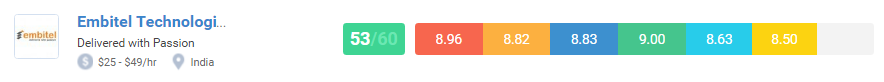 Based on their Client Reviews, Portfolio, Market Penetration, Experience, E-commerce Development, Ecommerce Design, Embitel’s scorecard highlights its performance by scoring 53 points out of 60.